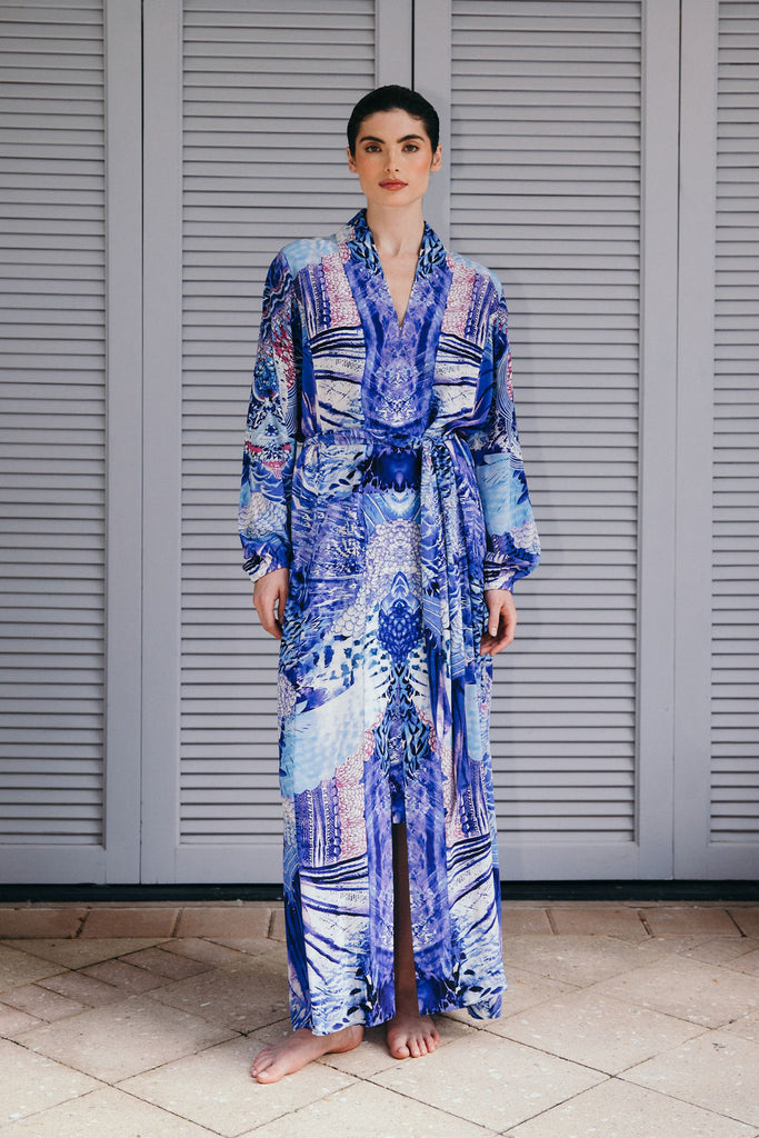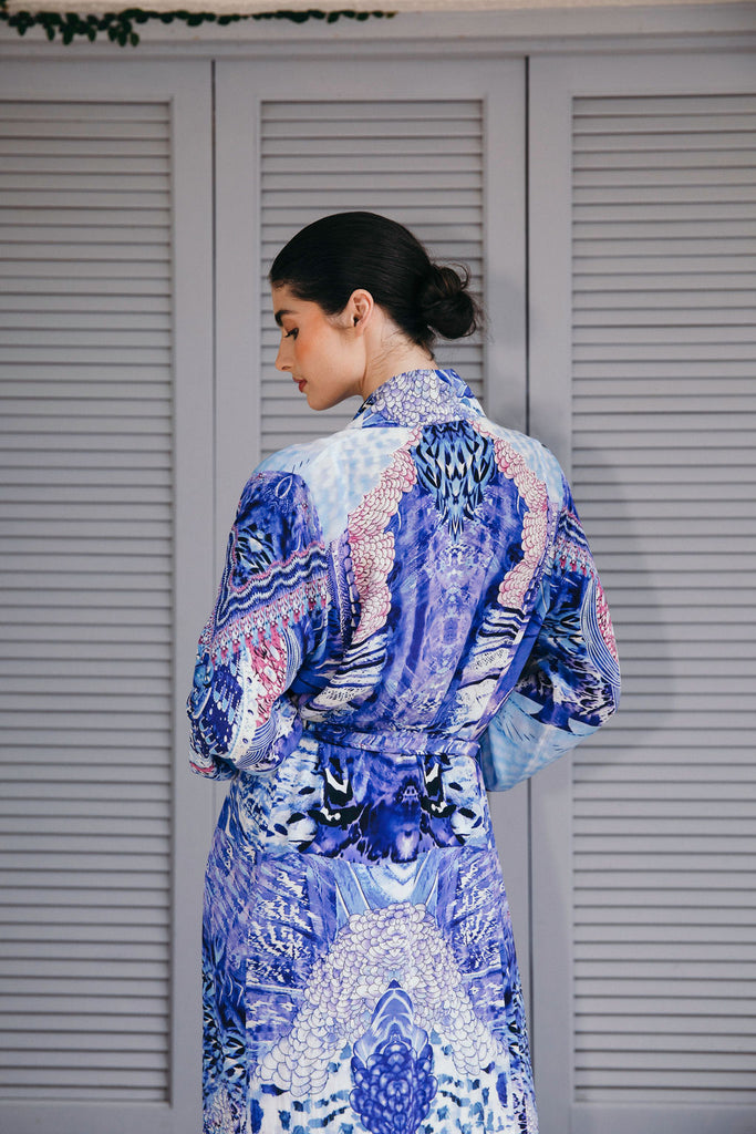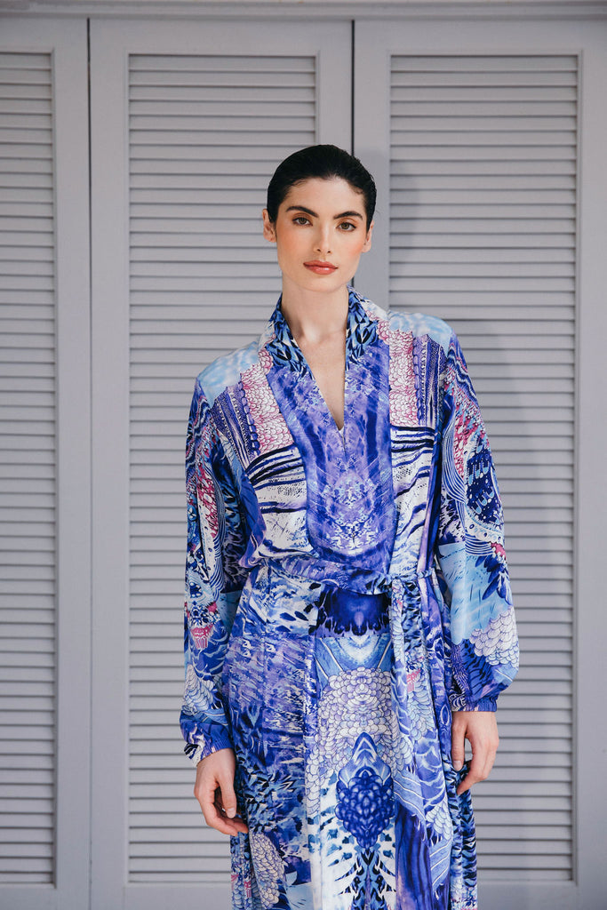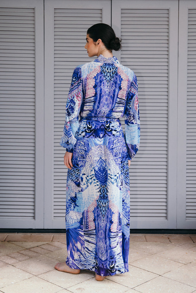 Designed to bring out the feminine essence, this long sleeve convertible caftan dress is defined by its vibrant print and will elevate your summer edits with an ebullient allure.