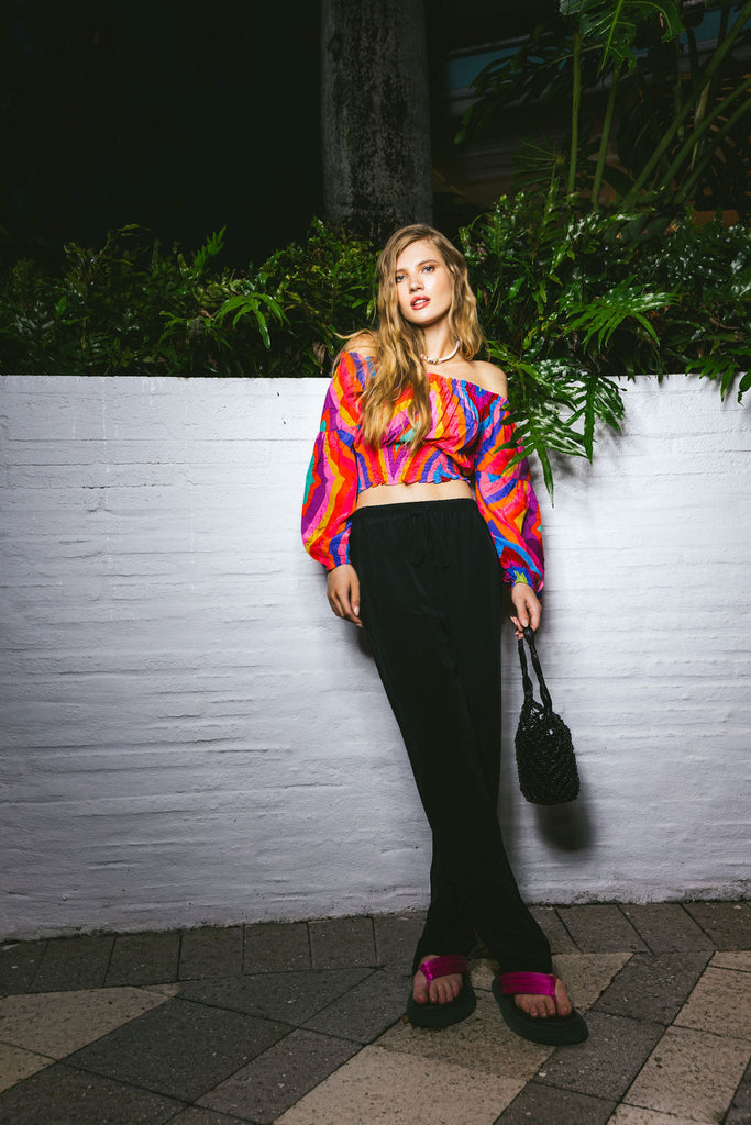 Refreshing your collection of daily separates with this top, rendered in a vibrant palette to imbue your wardrobe with a flamboyant appeal. Crafted into a cropped silhouette with smocked waist and billowy sleeves, this garment makes for an exciting update of your seasonal curations.